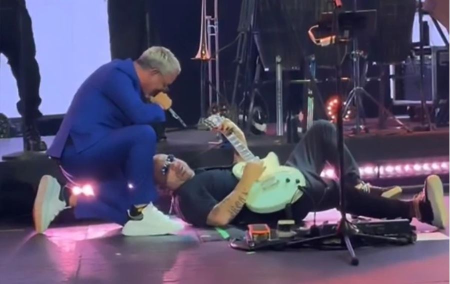Una vez en el piso, se aprecia a Sanz invitarlo a incorporarse, pero el guitarrista, como todo un showman, se dispuso a terminar la canción en el suelo ya que no estaba dispuesto a interrumpir la presentación.