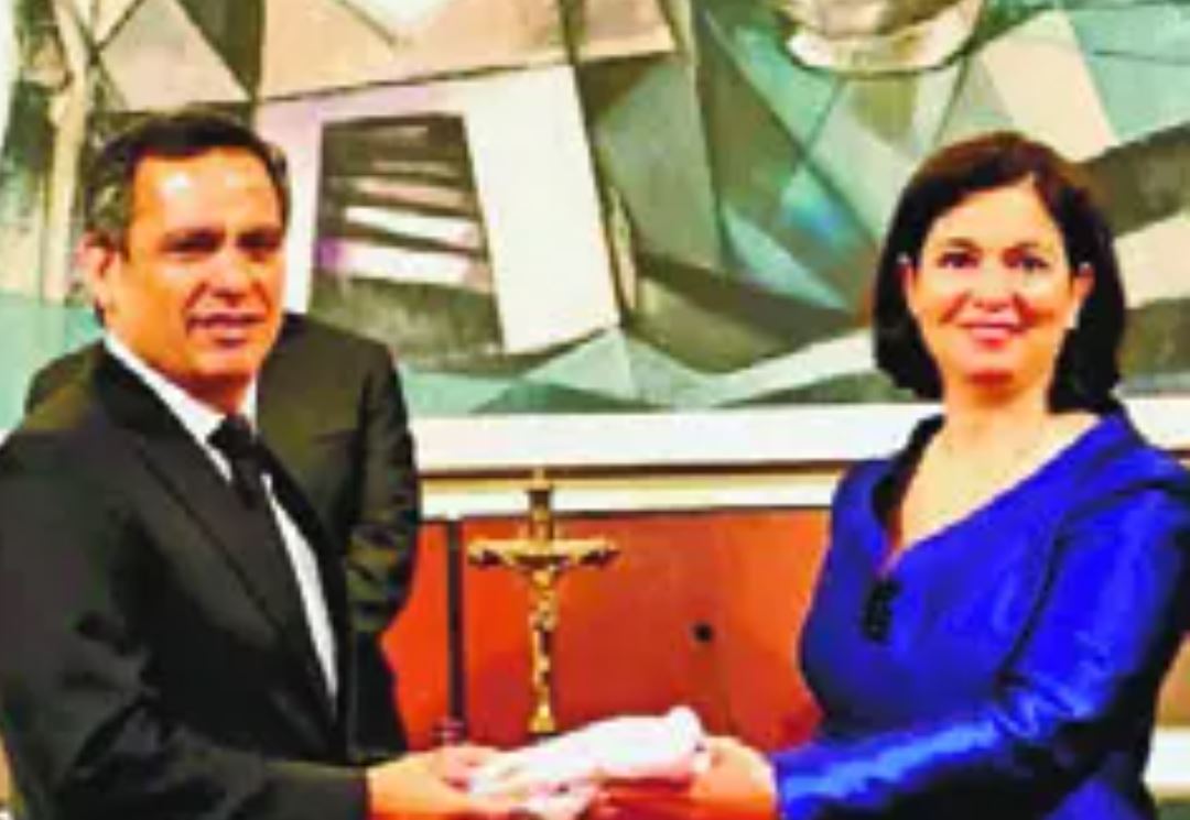 La magistrada Maite Oronoz Rodríguez, presidenta del Tribunal Supremo de Puerto Rico, entregó el mallete al presidente del Poder Judicial, durante el acto de inauguración en República Dominicana de la Reunión Ordinaria del CJCC, que se realizó en la Sala Augusta de la Suprema Corte de Justicia.