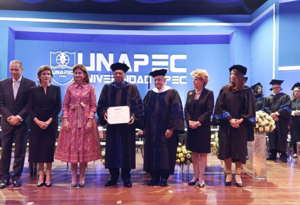 Acompañada de Elena Viyella de Paliza, presidenta de la Junta de Directores de UNAPEC; Fernando Langa, presidente del Grupo APEC; Norma Rivera de Vargas, miembro del Consejo APEC de Pasados Presidentes; Juan Viloria Santos, viceministro de Evaluación y Acreditación de las IES del Ministerio Educación Superior, Ciencia y Tecnología (MESCyT); además, miembros de la Junta de Directores y del honorable Consejo Académico de Unapec, compuesto por los señores vicerrectores, decanos y directores.
